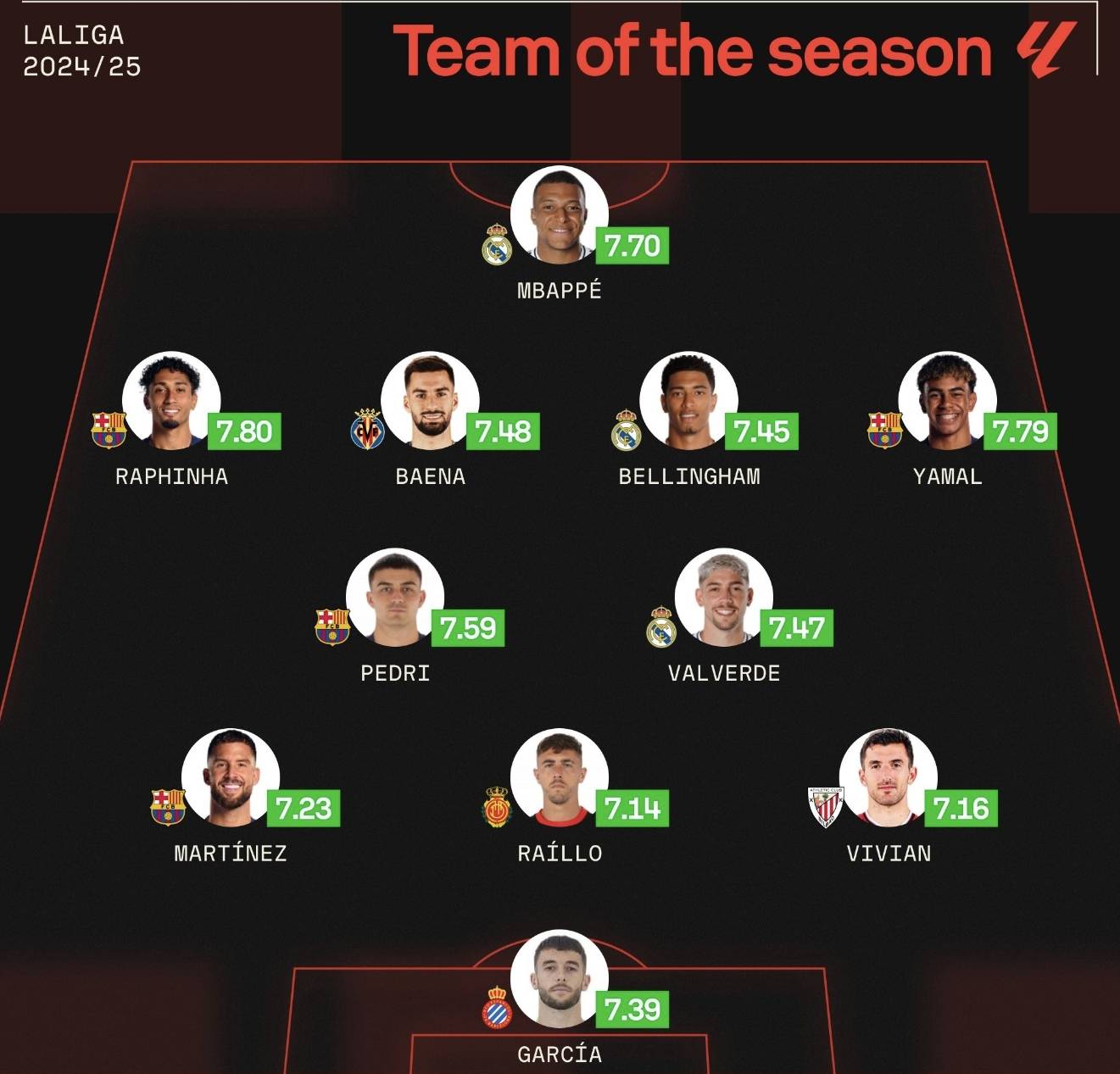 在中场的核心位置上,比利亚雷亚尔的巴埃纳凭借7.48的评分被选中,他的赛季数据为7球和9助,帮助球队挣得西甲第五名,并成功重返欧冠。皇马的贝林厄姆也表现不俗,他得到了7.45分,赛季中贡献9球并提供8次助攻,展现出攻守兼备的特点。佩德里以7.59的评分,以及巴尔韦德获得7.47分,双双出现在后腰位置。佩德里是巴萨中场的灵魂,而巴尔韦德则是皇马中场的多面手,以强劲的拼抢和远射能力著称。