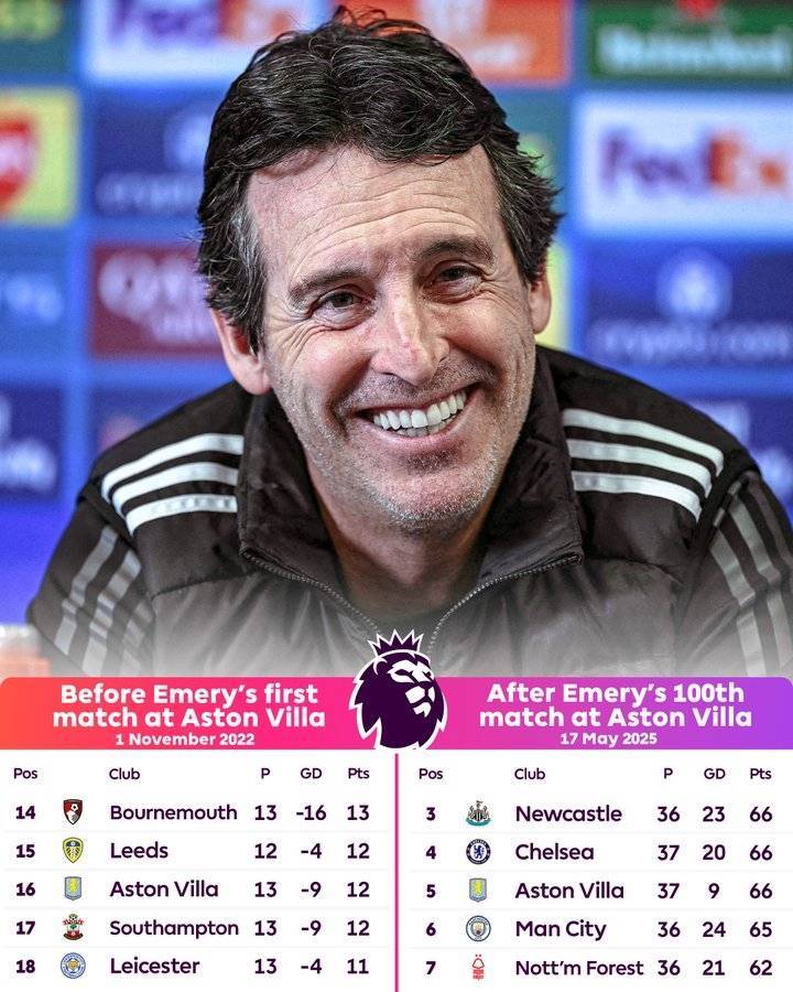 直播吧05月17日讯 埃梅里治下的阿斯顿维拉取得了惊人的变化。在埃梅里带领下的100场英超联赛后,他们本赛季有望实现连续两个赛季获得欧冠资格。